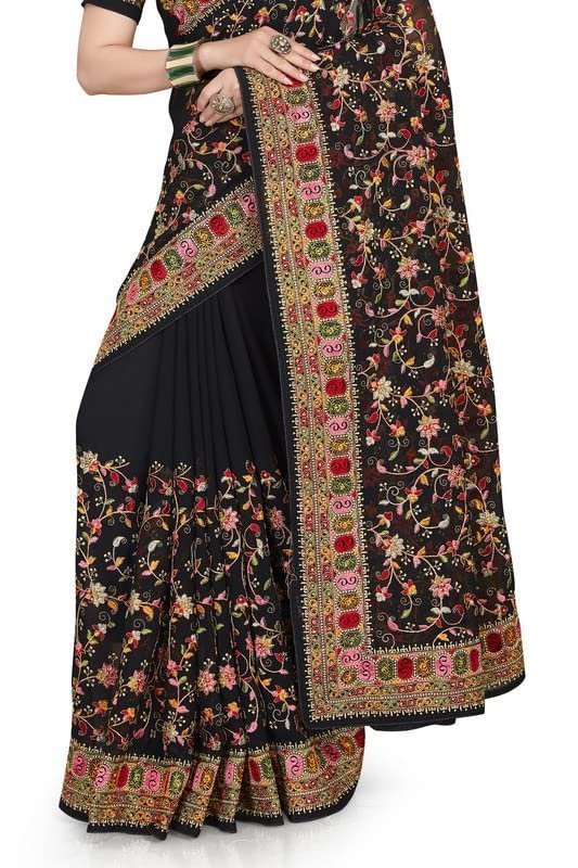 Black Kashmiri Resham Heavy Embroidered Border Work Georgette Saree Sari with Heavy Work UnStitch Blouse Piece For Women & Girls