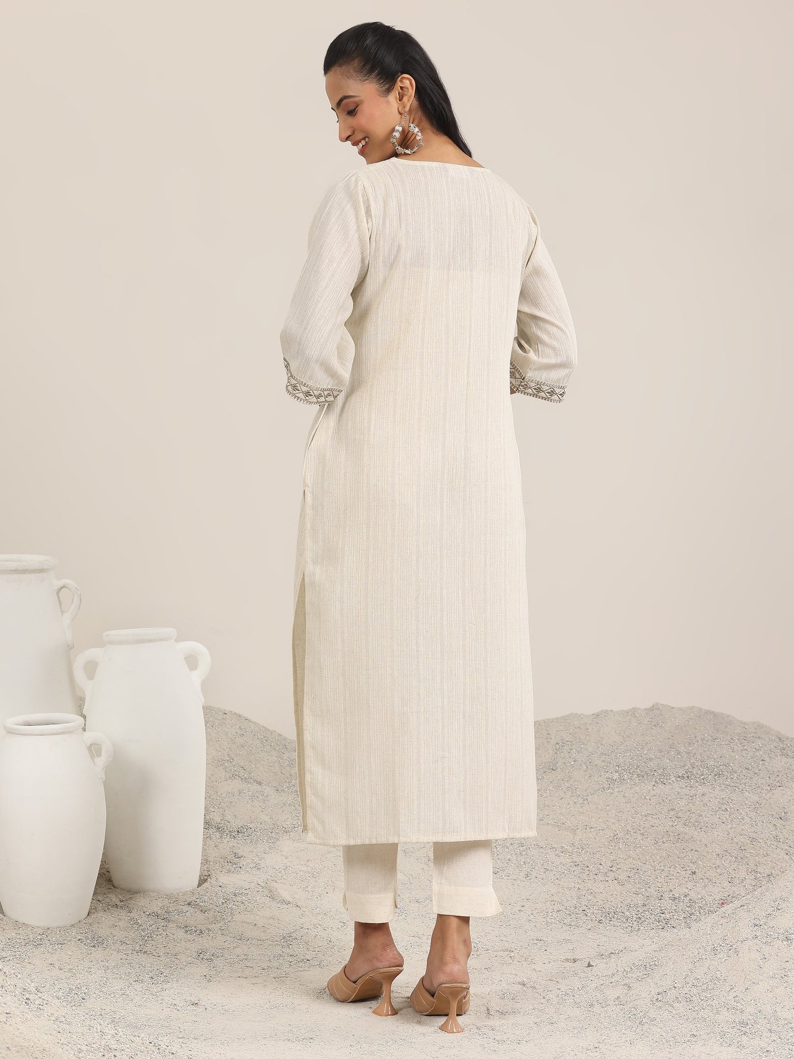 Off White Solid Cotton Blend Straight Kurta