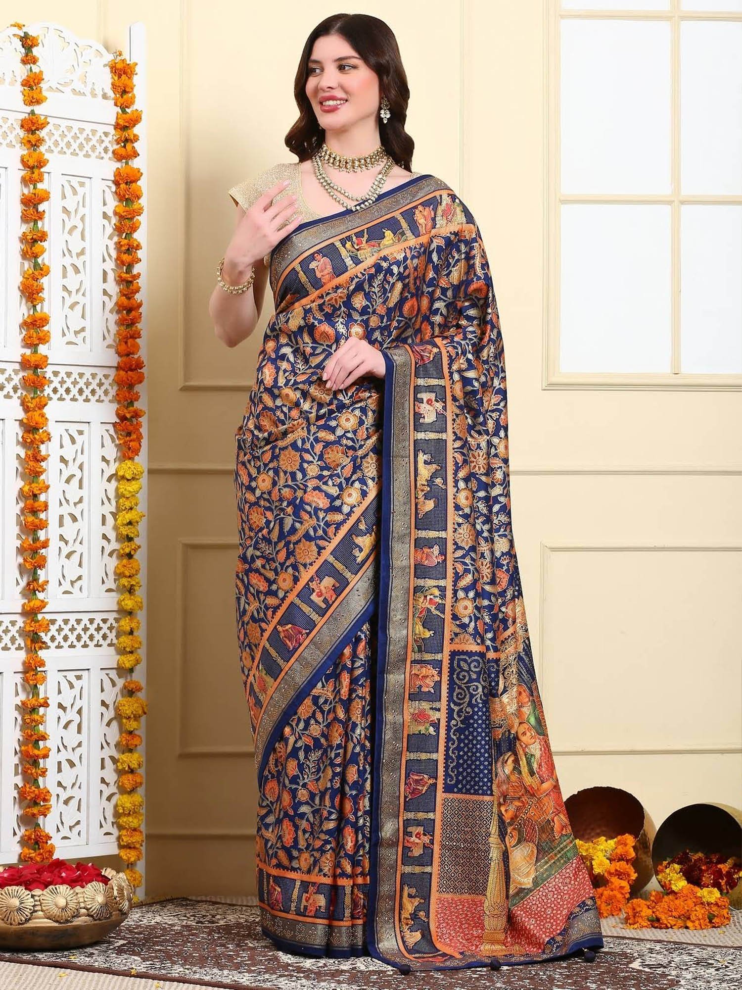Women Royal Blue Patola Silk Saree with Unstitched Blouse